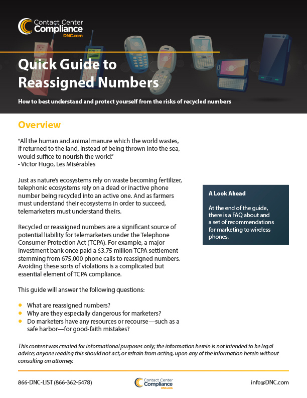 Recycled or reassigned numbers are a significant source of potential liability for telemarketers under the Telephone Consumer Protection Act (TCPA). For example, a major investment bank once paid a $3.75 million TCPA settlement stemming from 675,000 phone calls to reassigned numbers. Avoiding these sorts of violations is a complicated but essential element of TCPA compliance.